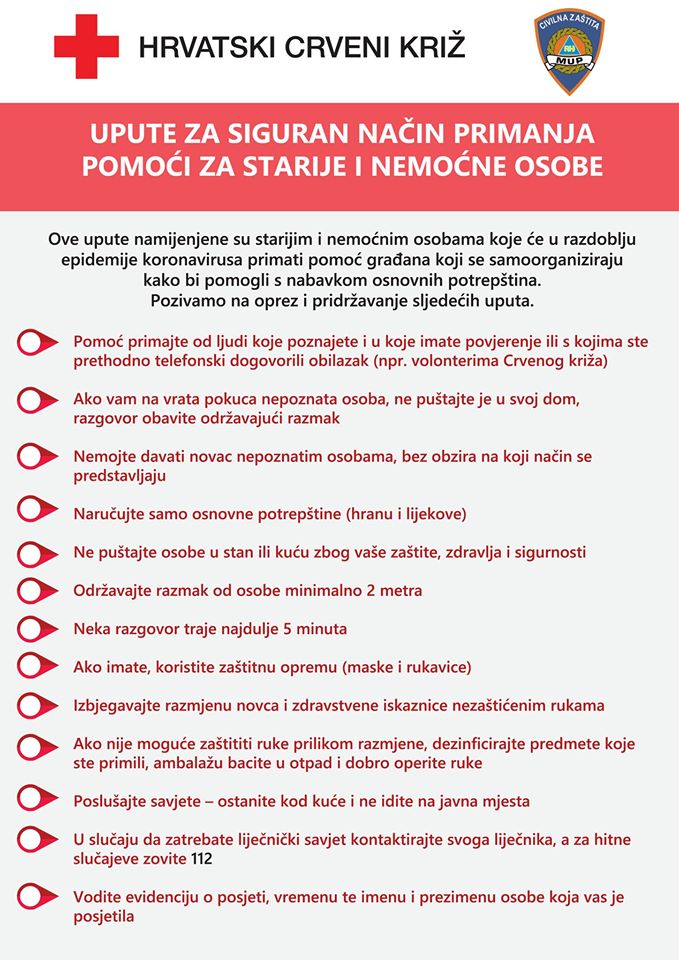 Upute za siguran način primanja i pružanja pomoći tijekom epidemije koronavirusa.